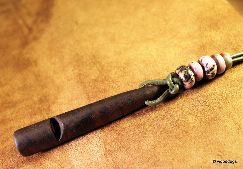 Hundeppeife Mahagoni pommele ca. 9 cm lang mit Pfeifenband aus gesäumten Rindsnappa mit Diamantknoten und Perlen aus Rhodonite